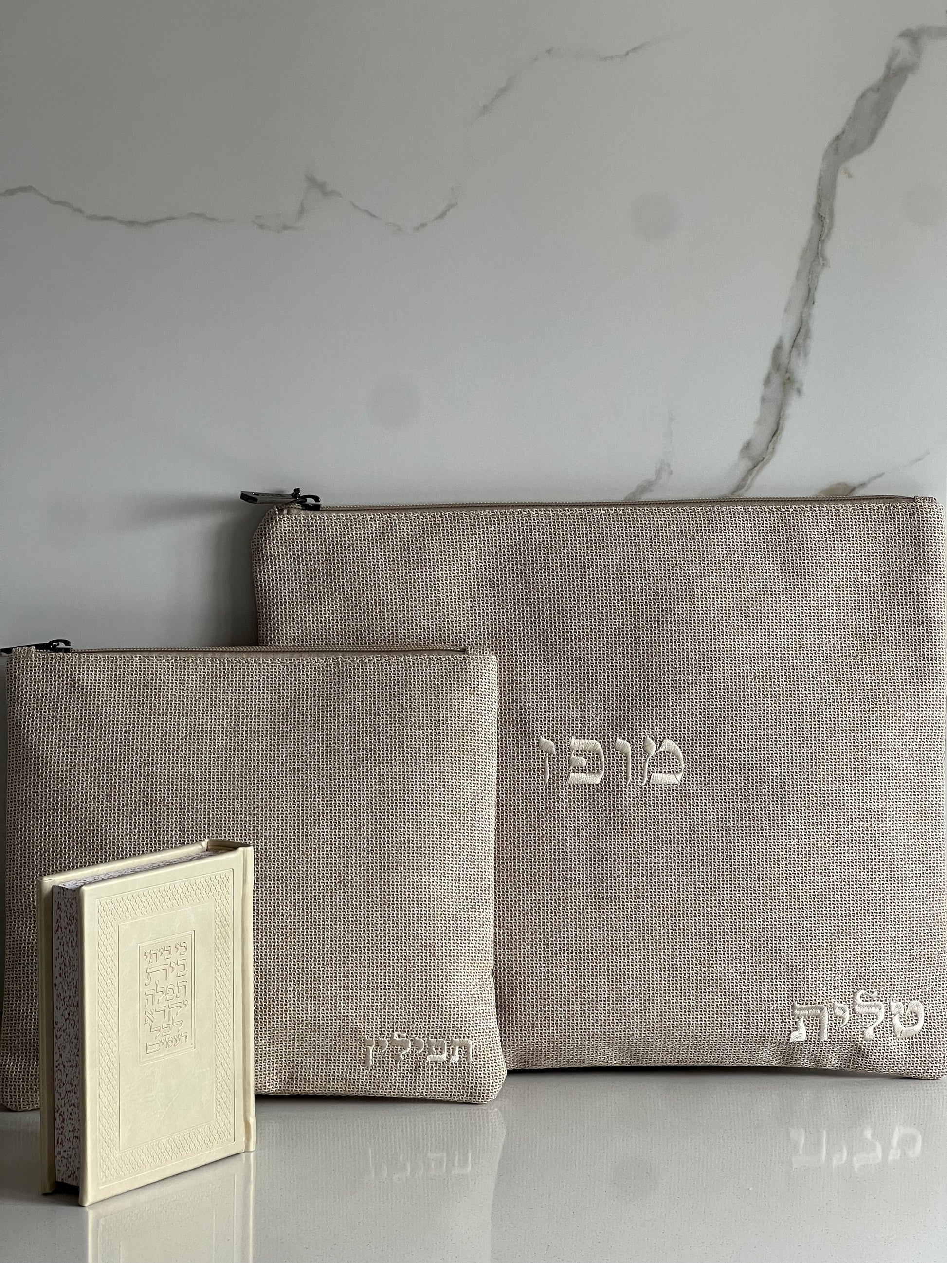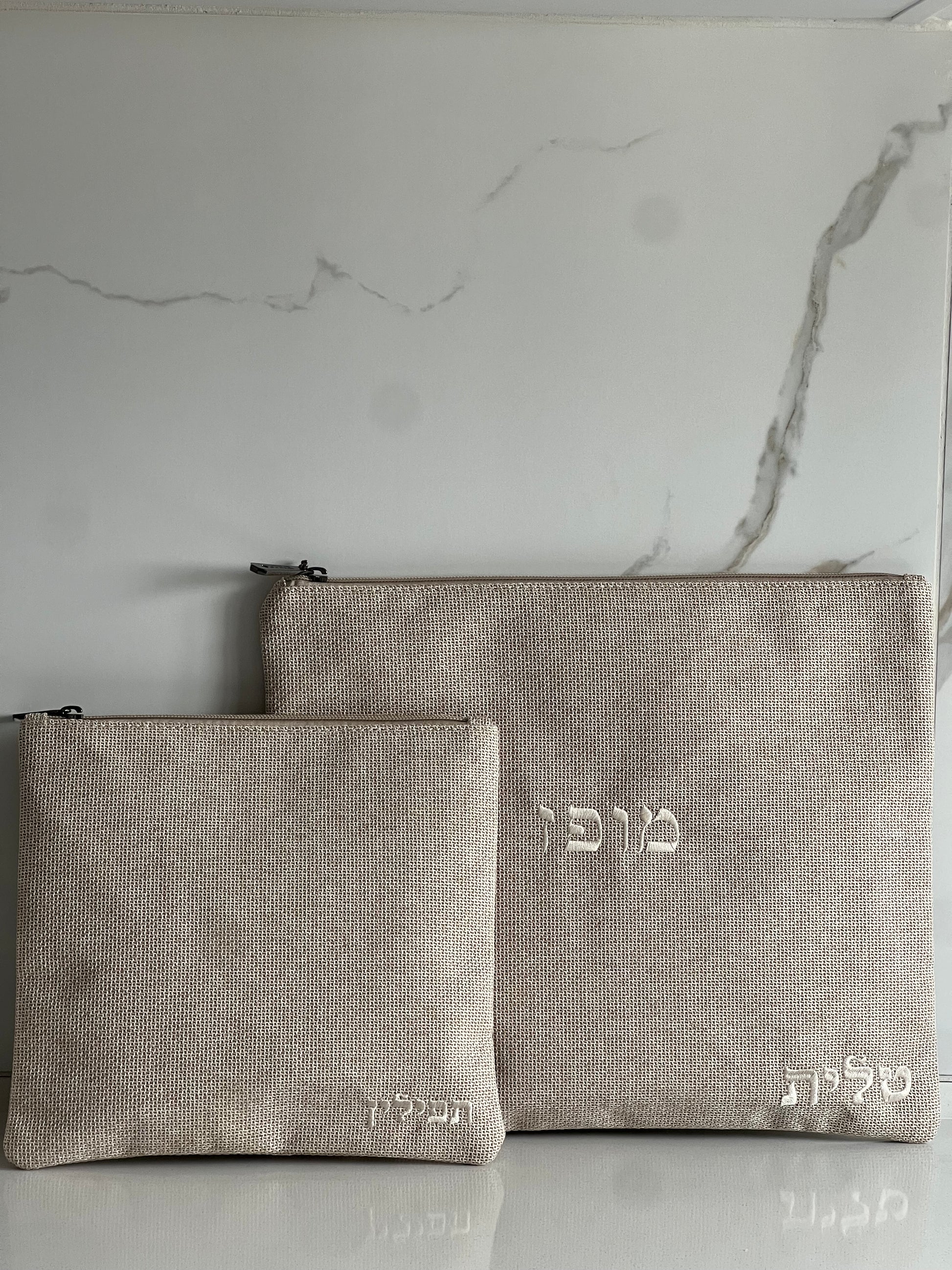 סט כיסוי תפילין וטלית בצבע בז׳ מבד פשתן עם רקמת שם
