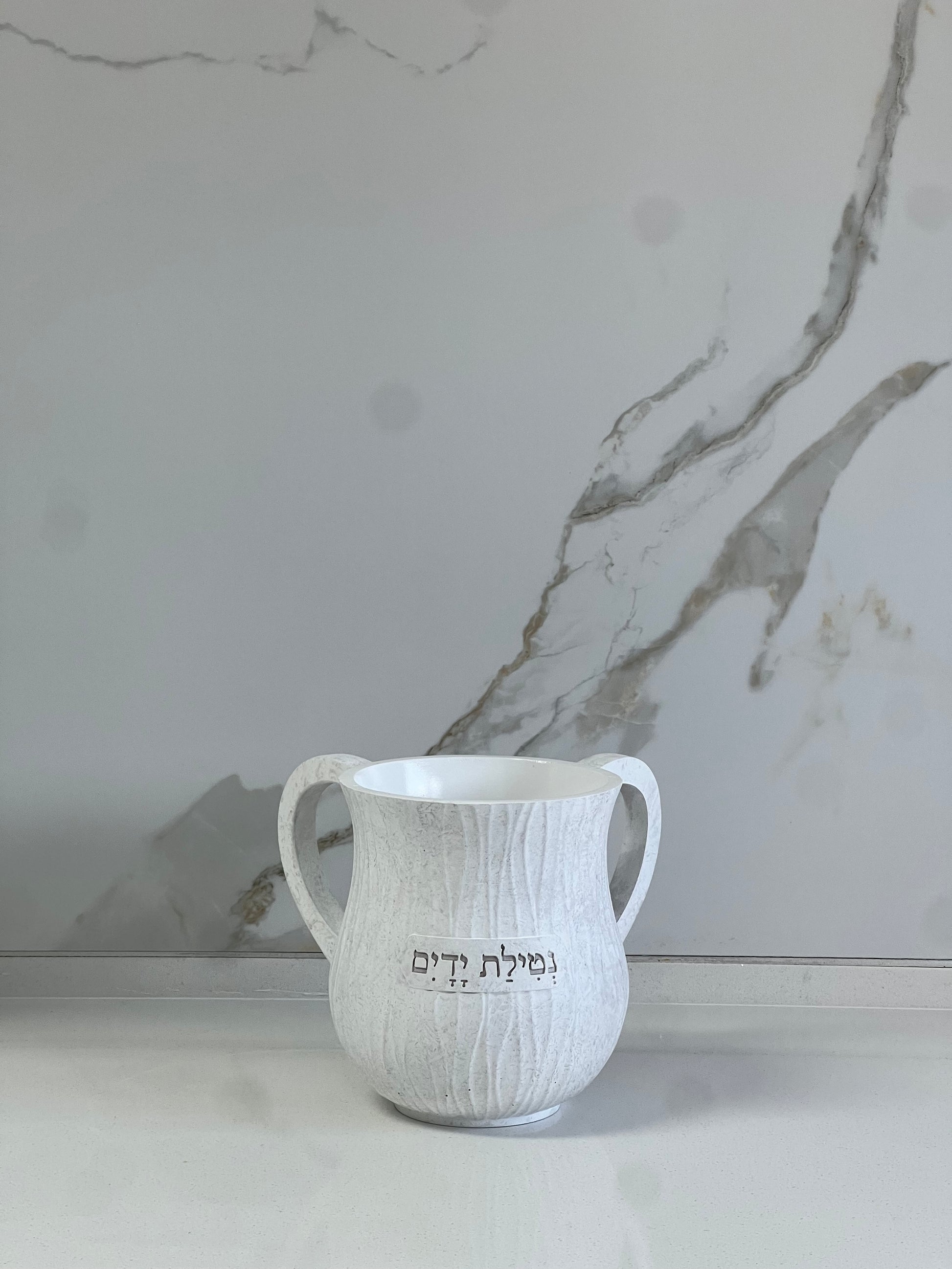 נטלה מהודרת לבנה עם טקסטורה שיש מיוחדת ומרשימה מפוליריזון 14 ס״מ, חריטת נטילת ידיים